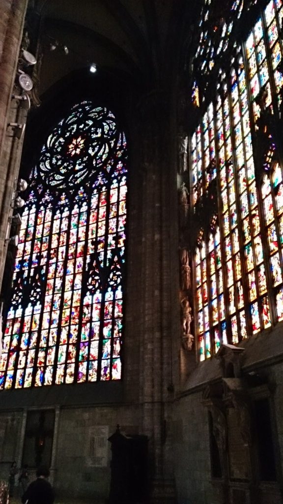 ステンドグラスは14世紀に作られ、新訳聖書の「ヨハネの黙示録」の場面が描かれています。さすが当時のヨーロッパの中心であるイタリアですね!